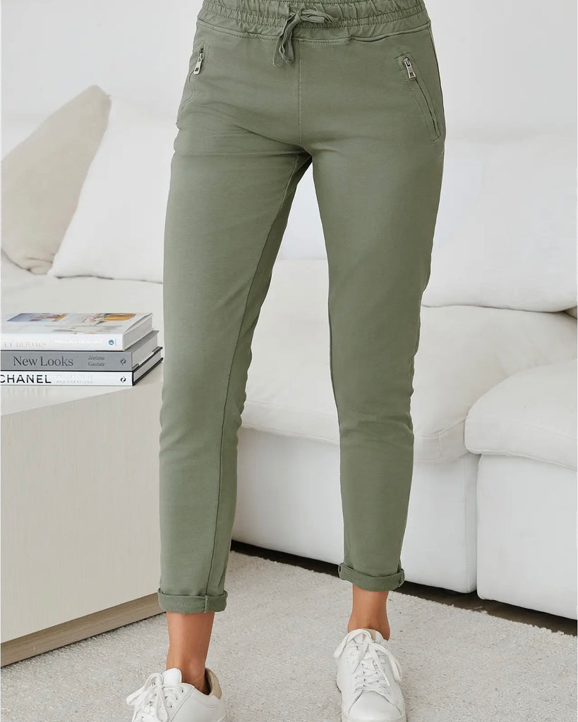 For a sleek look and comfortable fit, these track pants feature a drawstring waist, zip pocket and slim legs. Crafted from a lightweight fabric, these pants are perfect for any activity.