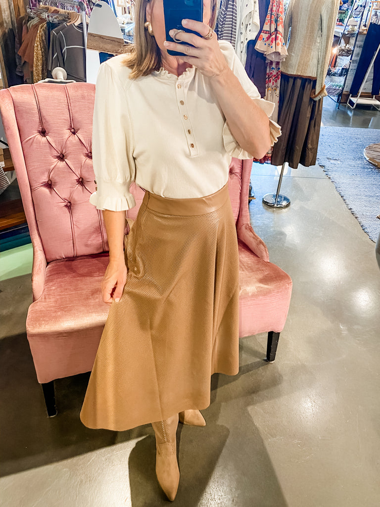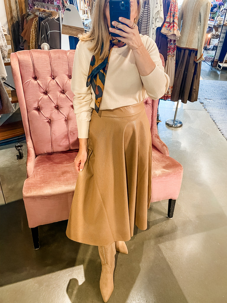 Add timeless elegance to your Fall wardrobe with this chic faux leather midi skirt. Designed with a flattering A-line silhouette, a smooth waistband for a comfy fit, and a subtle perforated texture, this versatile fall skirt pairs effortlessly with sweaters, blouses, or boots for day-to-night style.