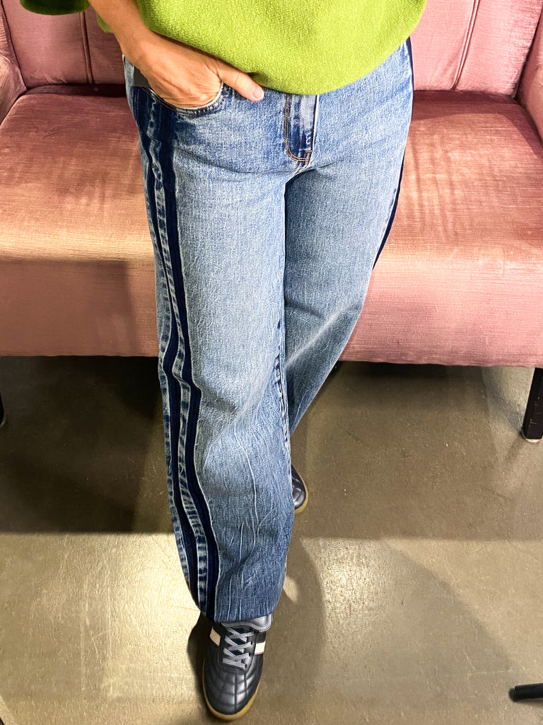 Sleek meets structure in these high-rise, straight-leg jeans, finished with bold dark contrast side lines for a sharp, sculpted look. The five-pocket styling keeps it classic, while the medium wash and super stretchy material bring all-day ease.