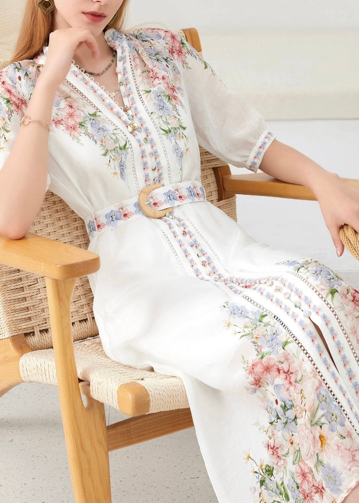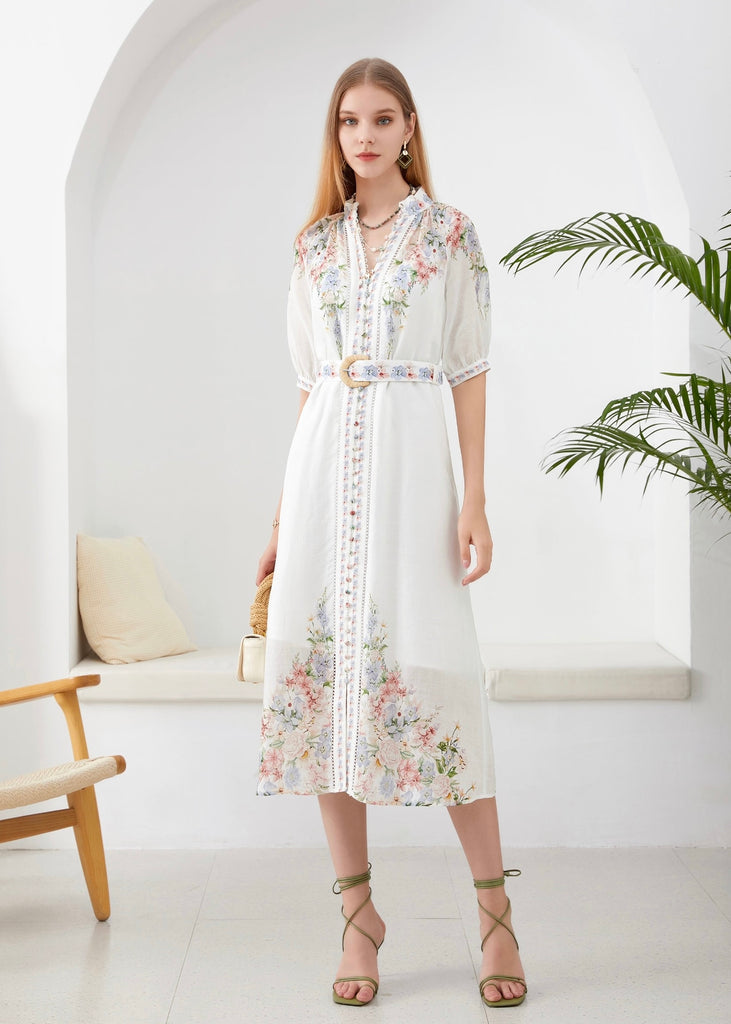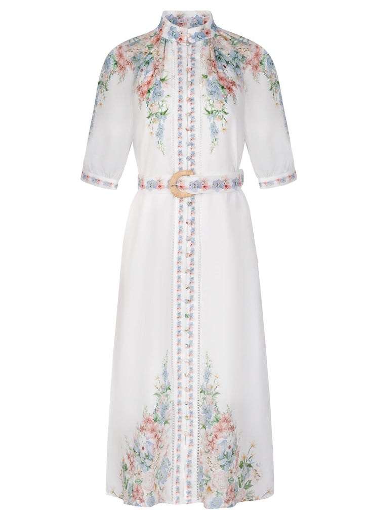 Designed with a soft watercolor-inspired floral print in delicate shades of blush, blue, and green, it features a high neckline, fabric-covered button front, and subtle pleated detailing for a refined finish. The matching belt with a woven buckle gently defines the waist, while the flowy midi-length skirt creates beautiful movement with every step. Lightweight and polished, it’s perfect for spring events, showers, church, or garden parties.