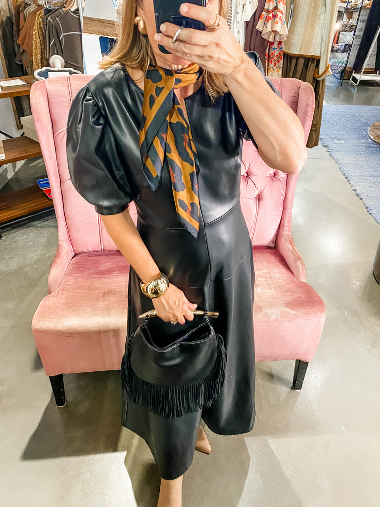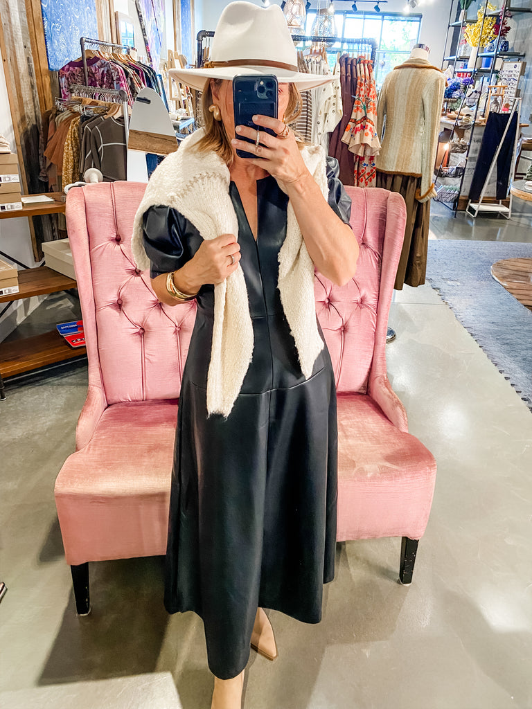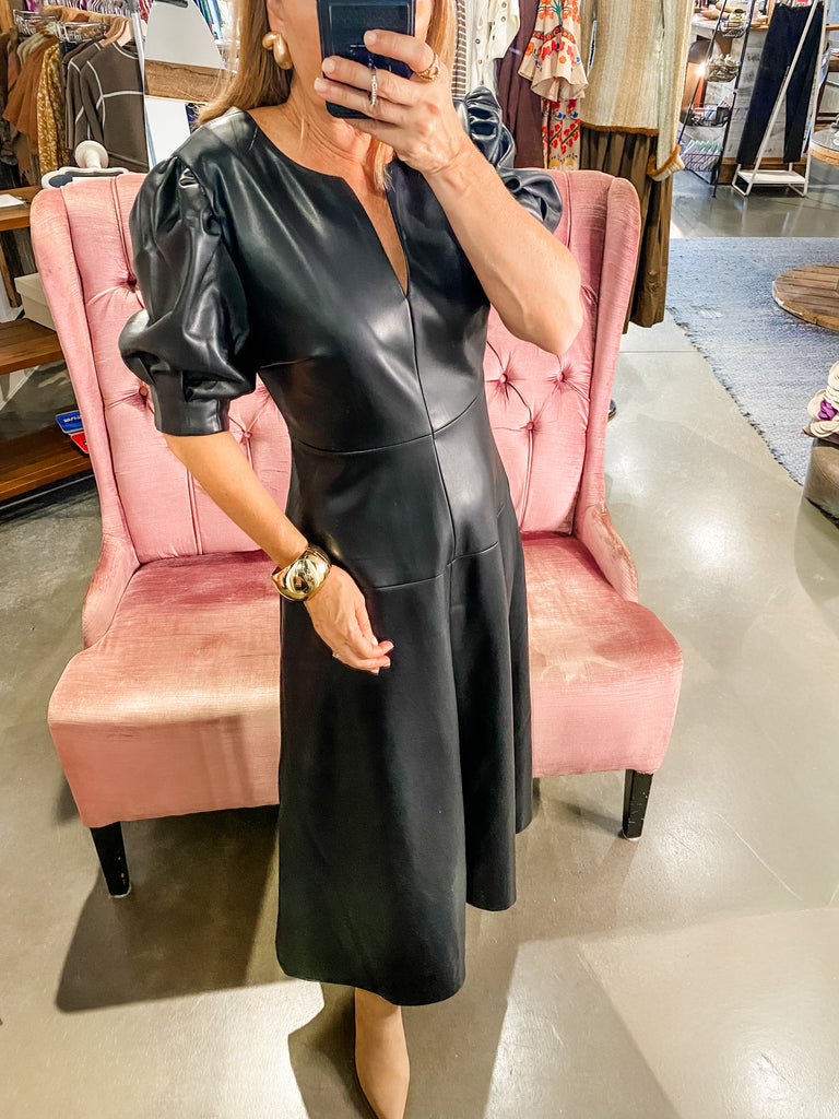 Make a statement this season with our faux leather maxi dress, featuring puff sleeves, a sleek V-neckline, and a flowing A-line silhouette.