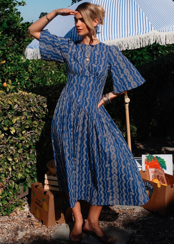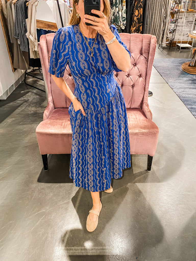 This eyelet embroidered maxi dress features a timeless boat neckline and flattering half sleeves for an effortlessly elegant look. Designed with a fitted smocked waist, it creates a beautifully defined silhouette that flows into a graceful maxi-length skirt. A back zipper closure ensures easy wear, while the lightweight design makes it perfect for any occasion.