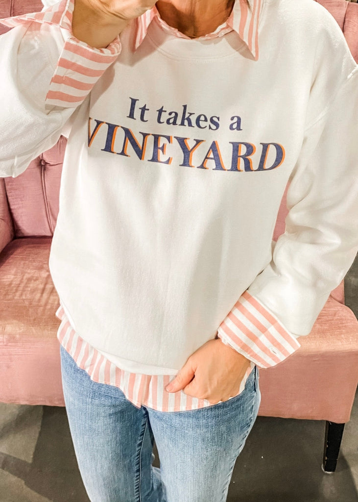 Raise a glass to cozy style with our playful It Takes a Vineyard sweatshirt. Made for wine lovers and weekend wanderers, this soft fleece pullover delivers laid-back comfort with a charming, conversation-starting graphic.