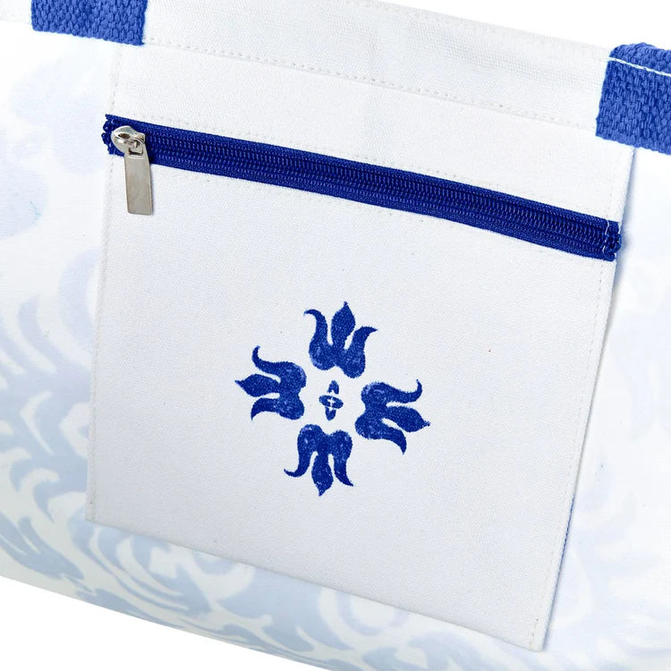 Made from durable cotton canvas, this tote features a charming blue tile design. The spacious interior, complete with an inside zippered pocket, makes it perfect for stashing your essentials while on the go. Whether you're headed to the beach, grocery shopping or running errands in the city, this tote is a must-have accessory for any style-savvy individual.