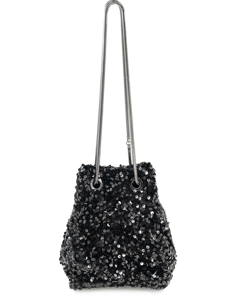 This small chic bag adds instant glamour to any look with its all over sequin design. It features a soft, slouchy silhouette, silver-tone chain straps and a single button clasp. Perfect for evening outings or special occasions, it offers just the right touch of sparkle and sophistication. Measures 6 in x 8 in x 4 in.