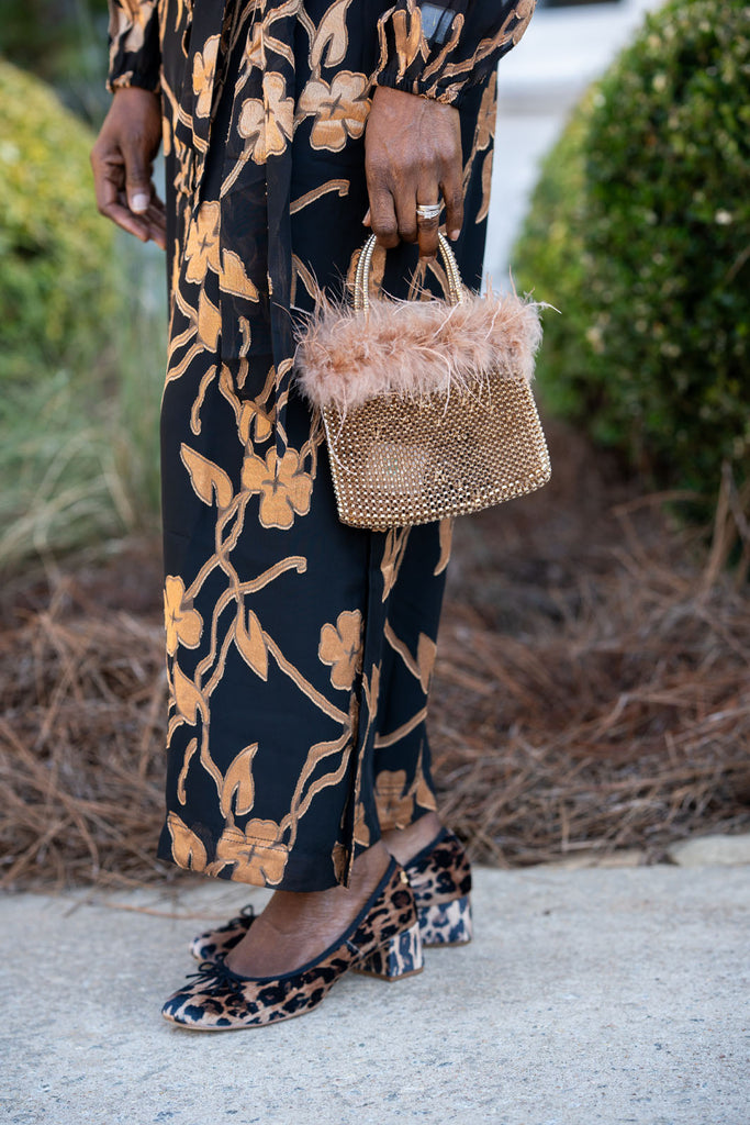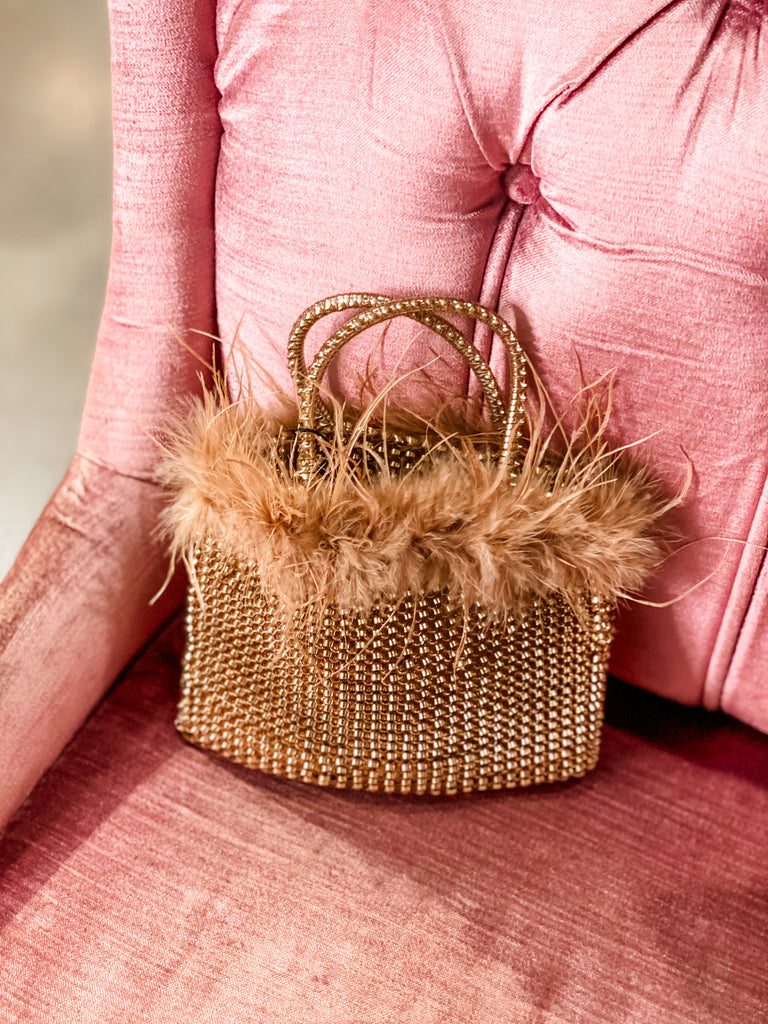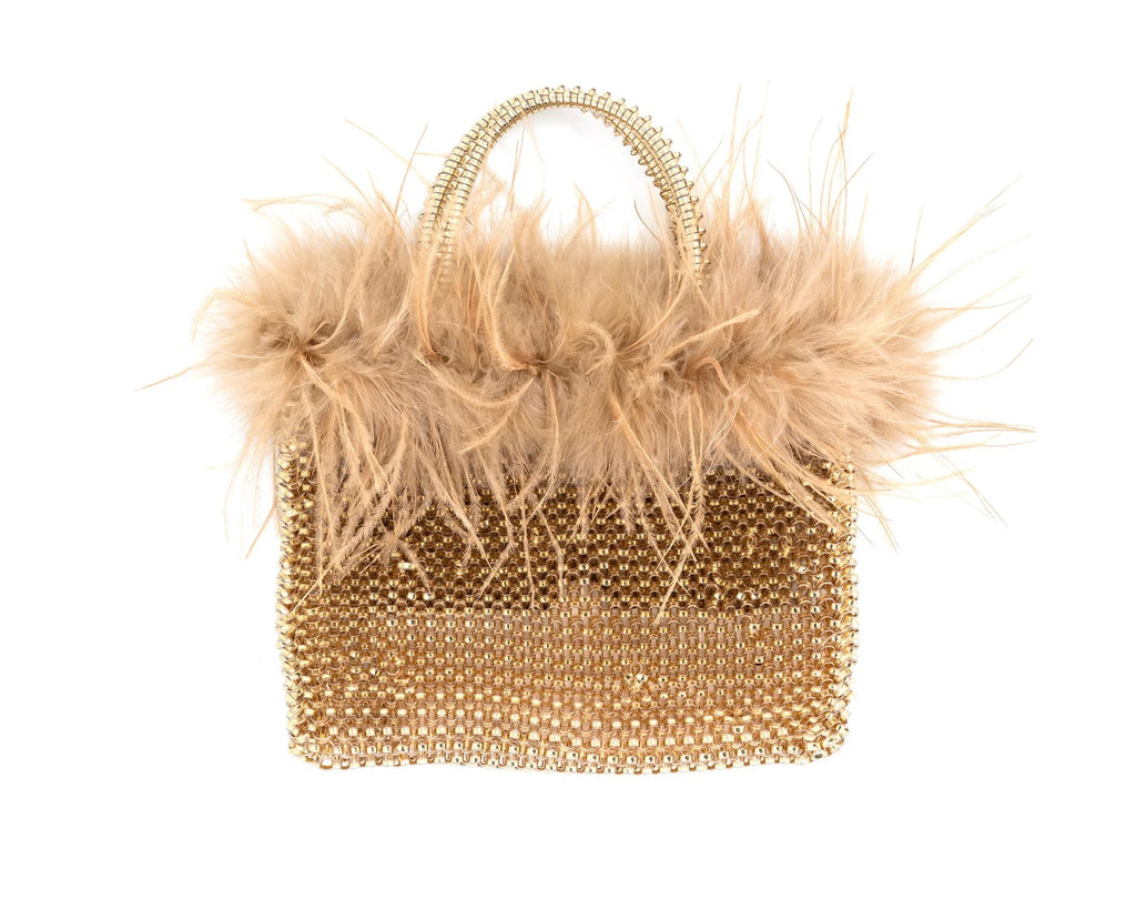 Designed with a shimmer woven design and topped with a playful feather trim, this statement bag is perfect for evenings out, holiday parties, or any occasion that calls for a little extra sparkle. Compact yet eye-catching, it’s the finishing touch for the perfect outfit.