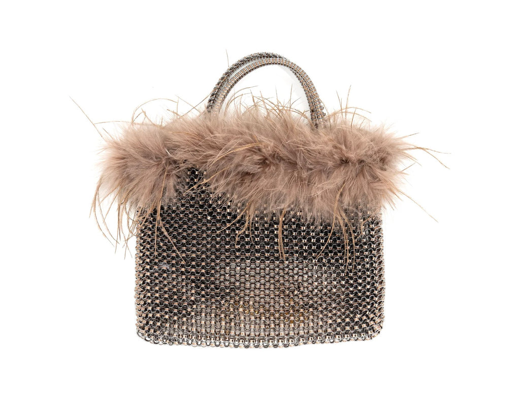 Designed with a shimmer woven design and topped with a playful feather trim, this statement bag is perfect for evenings out, holiday parties, or any occasion that calls for a little extra sparkle. Compact yet eye-catching, it’s the finishing touch for the perfect outfit.
