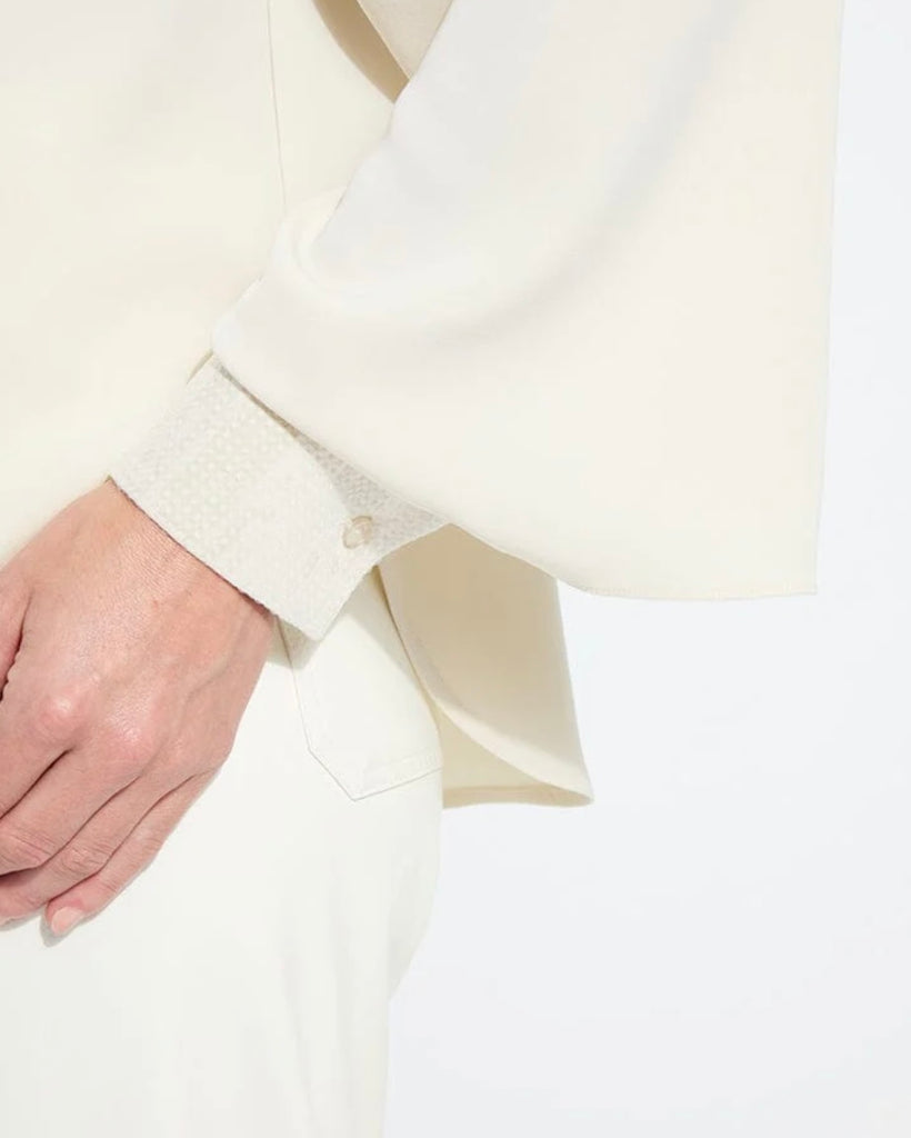 Made from wrinkle-resistant Stretch Woven fabric with transparent sequin embroidery on the collar and cuffs, the Damari Sequin Embellished Shirt is a chic button down that elevates jeans and pants. True to size with exaggerated statement sleeves and a curved hem, the Damari Sequin Embellished Shirt styles beautifully with our Hi Waist Vegan Leather Wide Leg and boots and our Callie Pant Shimmer Pant.