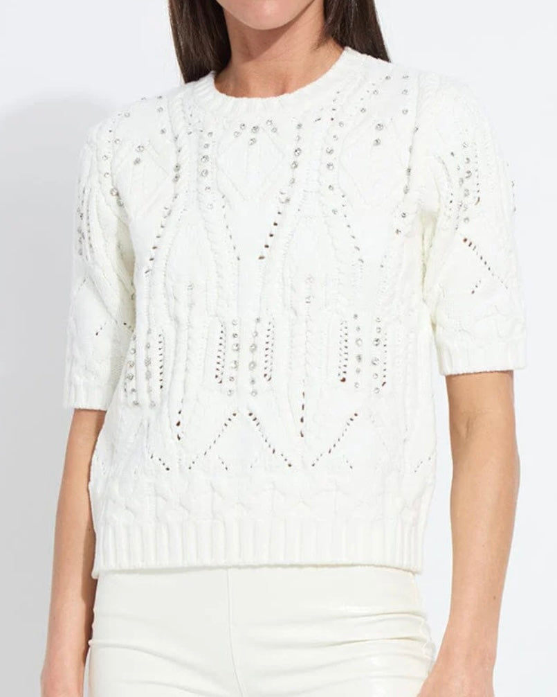 The Hadley Cozy Short Slv Embellished Sweater showcases placed, hand-attachedSilver Crystal embellishments, a complex cable pattern and open pointelle stitching. Made from soft Cozy Cable, this heirloom-quality sweater is true-to-size and styles beautifully with a simple tank and the Amara Straight Flare Pant. Turn inside out to machine wash. Dry flat. Store folded, never hung.