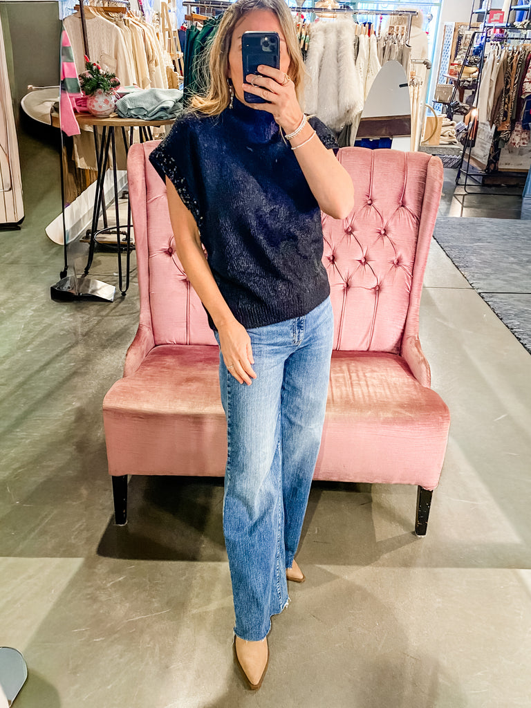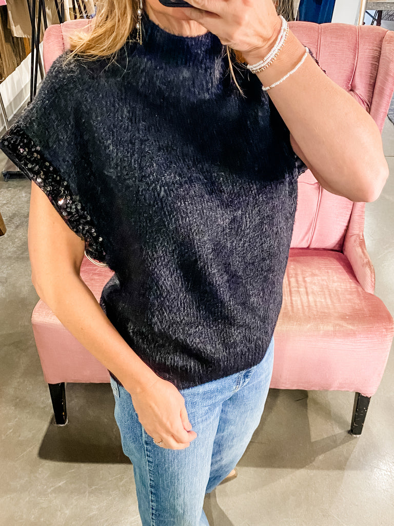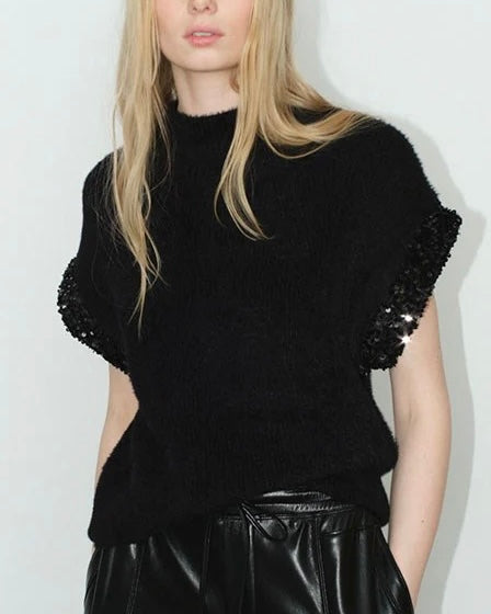 Designed with a relaxed, slightly boxy silhouette, it combines comfort with modern sophistication. The short sleeves feature a subtle, sequin boucle-style trim that adds dimension and a touch of refined detail.