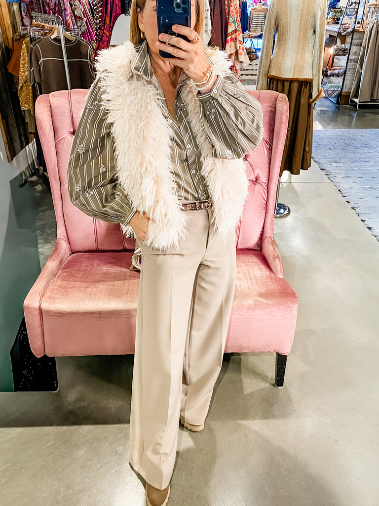 Afghan faux fur gilet with a rich satin lining. Great paired with our Tibi Scoop Lace Top and a favorite jean.