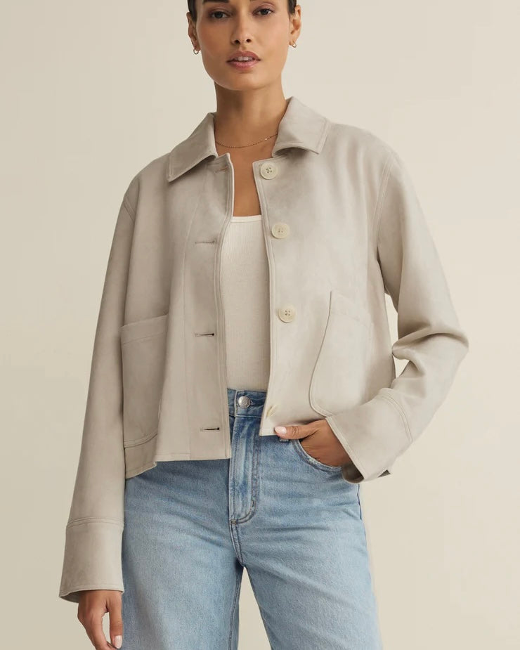 This cropped jacket is crafted from supple faux suede for a smooth, touchable finish. The boxy fit and button-front design make it a versatile layer that feels as good as it looks.