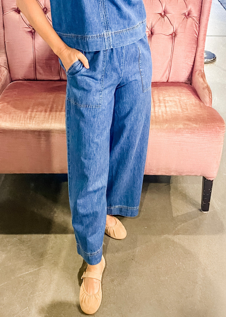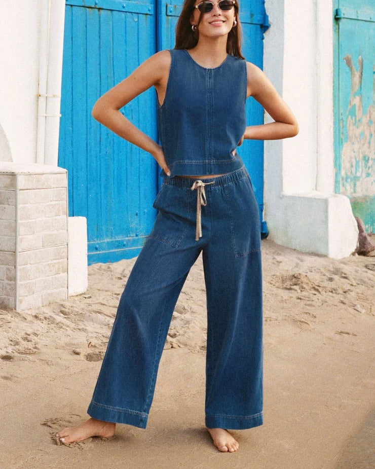 Count us in for ultra soft denim made of 100% cotton. These wide leg pants feature patch pockets, drawcord waistband and midweight feel to them. Dress it up or down with its matching top or a simple tank.