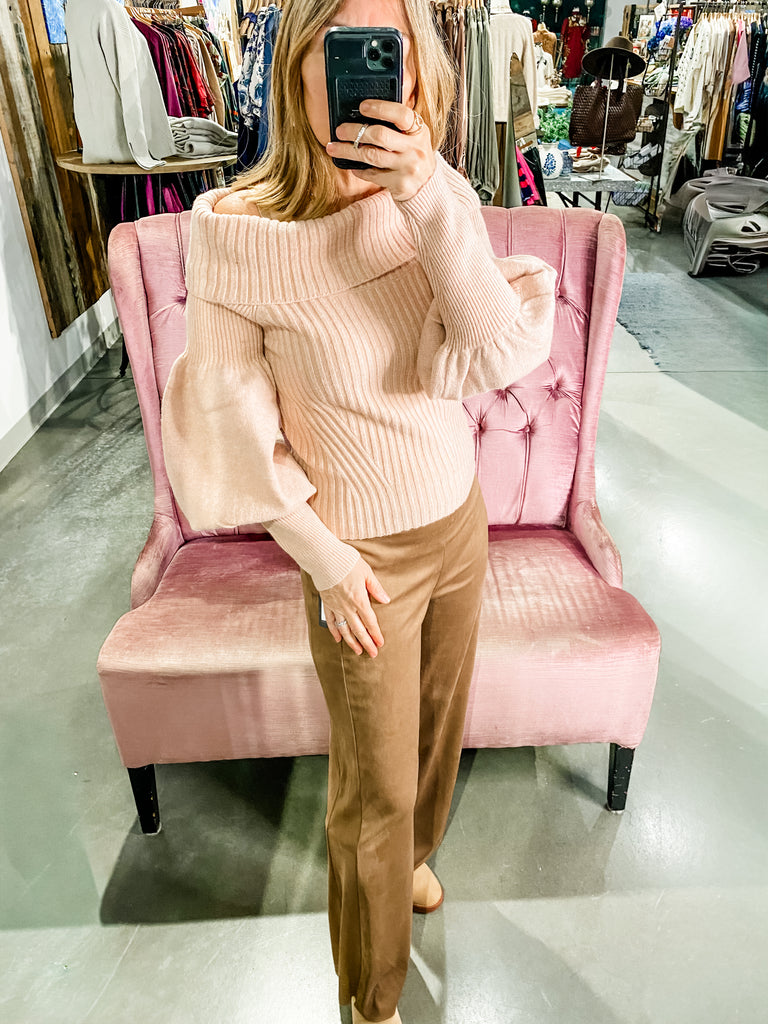 Our Victoria Sweater features  a generous turtle neckline, billowed sleeves and fitted cuffs.