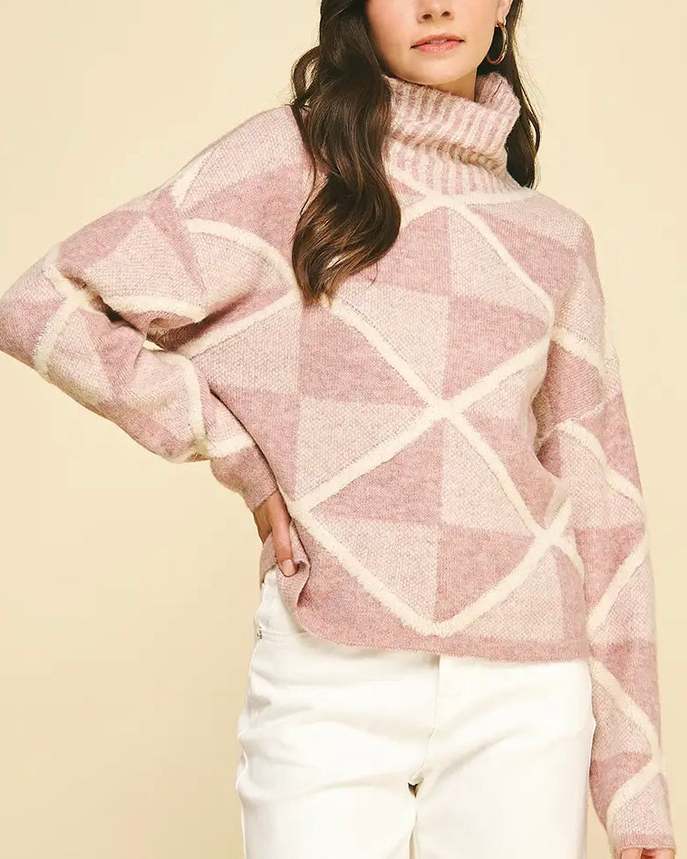 Cozy meets modern in this statement knit. Featuring a soft geometric pattern, this sweater is designed with a relaxed silhouette and an effortlessly chic turtleneck. The textured knit adds warmth without feeling bulky, making it perfect for layering or wearing on its own.