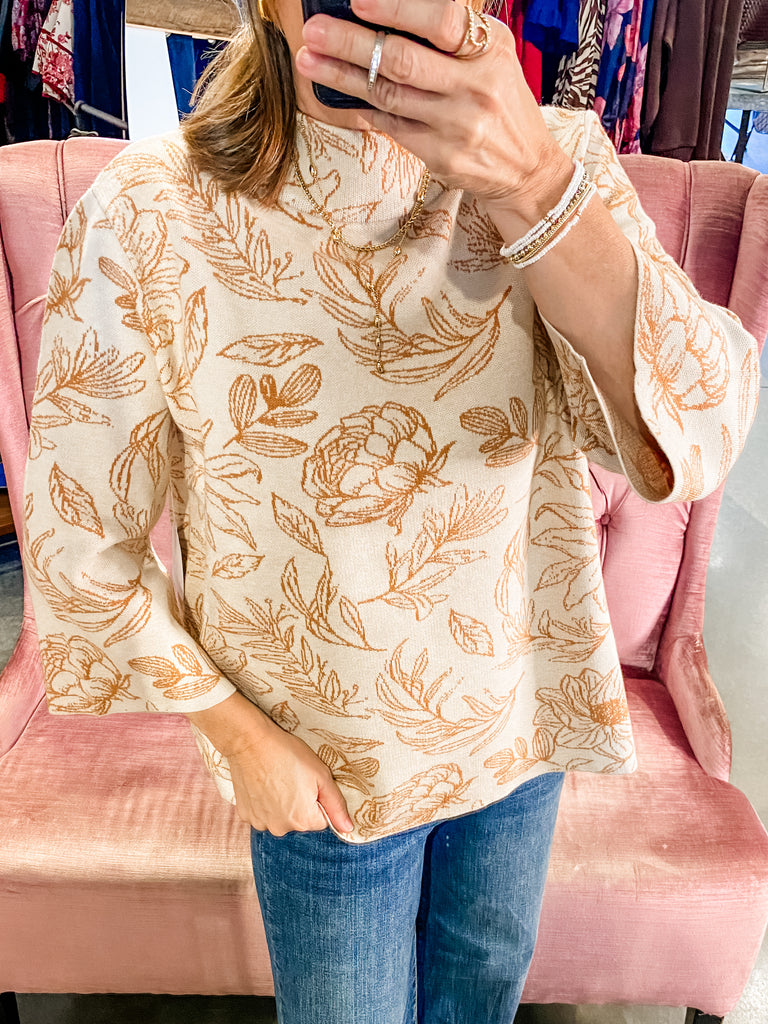 In a perfect shade of Fall, our Floral Sweater has a relaxed fit, high neckline, and wide sleeves for a chic, modern silhouette.
