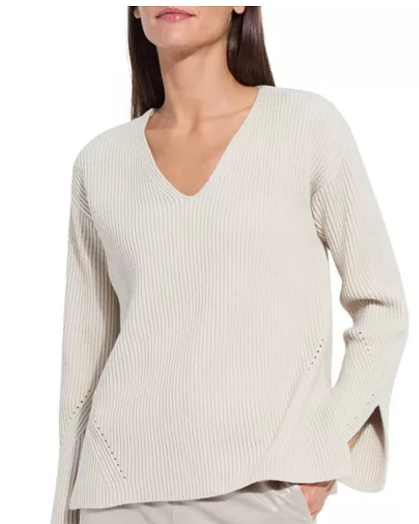 Our ribbed knit sweater is all about texture and detail. Designed with a flattering V-neckline, drop shoulders, and long sleeves finished with split bell cuffs, it blends comfort with a touch of elegance. The geometric pointelle stitching adds a subtle statement, crafted with a fully fashioned knitting technique for a refined finish. Side slits at the hem create a relaxed, flattering drape — perfect for pairing with your favorite denim or trousers for an elevated everyday look.
