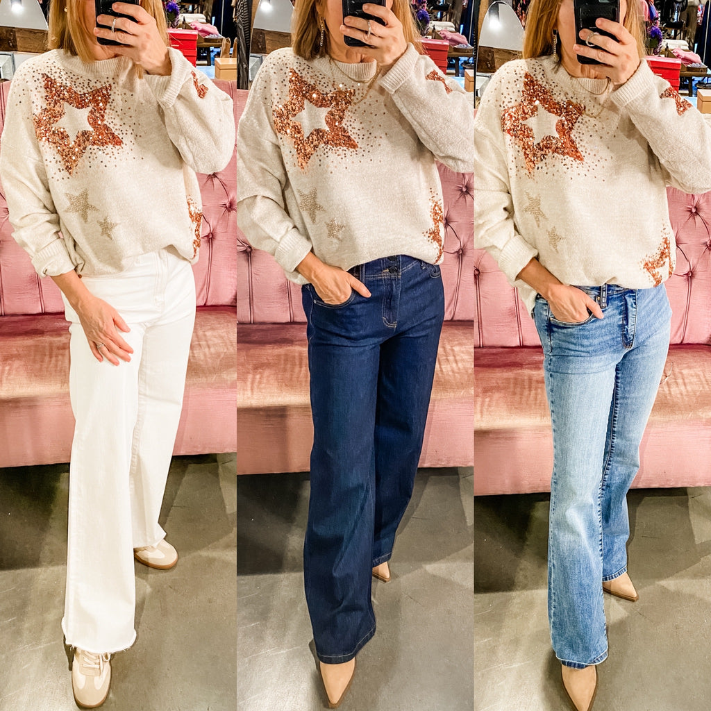 This soft sweater features shimmering sequin star accents scattered across the front and sleeves for just the right touch of glam. Designed with a relaxed fit, classic crew neckline, and cozy knit feel, it’s effortlessly chic for day or night.