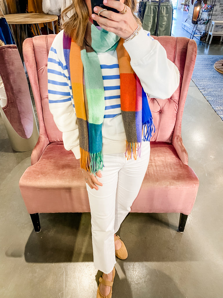 Fresh, timeless, and chic — this ivory crewneck with bold blue stripes is the kind of staple you’ll reach for again and again. Designed with a relaxed, flattering fit and ultra-soft fabric, it layers beautifully or stands on its own for easy everyday style.