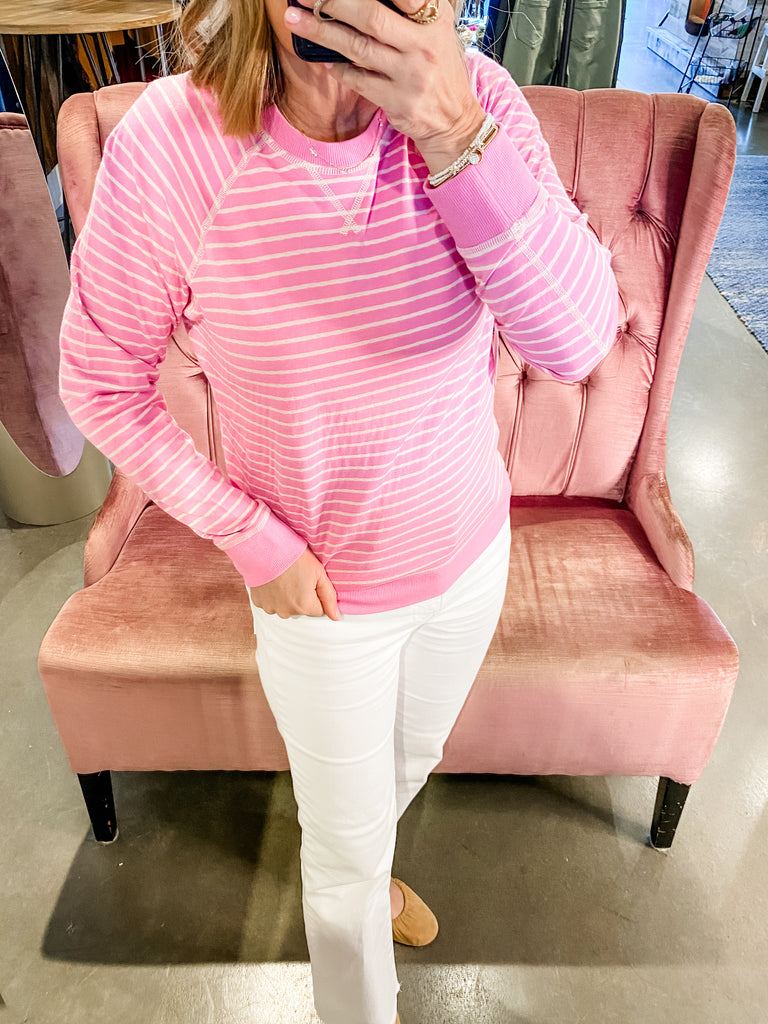 Fresh, timeless, and chic — this ivory crewneck with bold blue stripes is the kind of staple you’ll reach for again and again. Designed with a relaxed, flattering fit and ultra-soft fabric, it layers beautifully or stands on its own for easy everyday style.