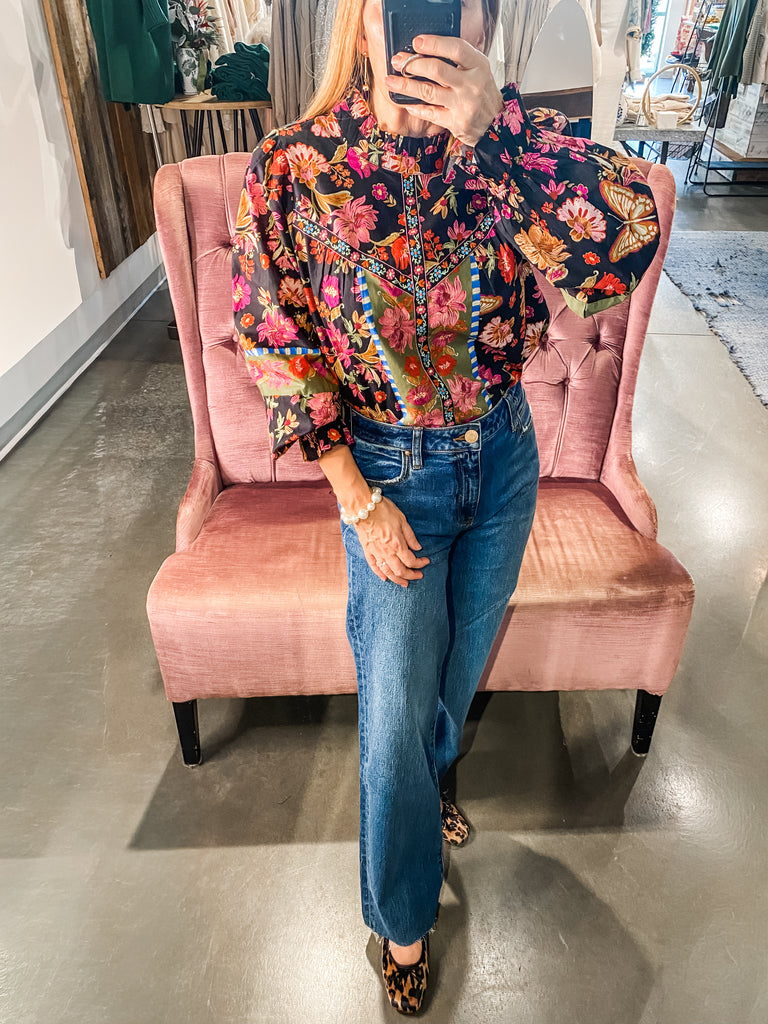 A poplin floral top with long sleeves & elasticized cuffs, a ruffle mock neck and back button closure.