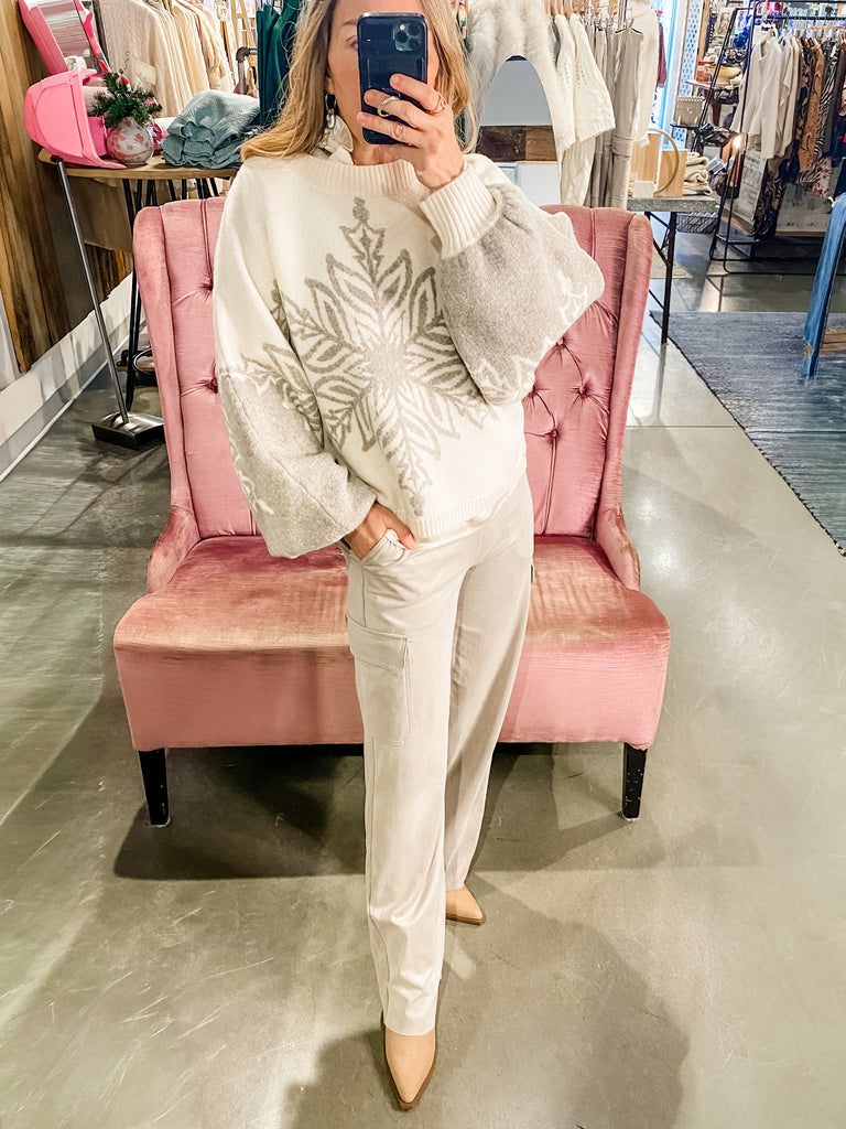 Featuring an oversized winter-inspired motif across the front and softly contrasting sleeves, this sweater brings effortless seasonal style with a luxe feel. The relaxed fit and balloon sleeves add a modern silhouette, while the soft knit keeps it ultra-comfortable.