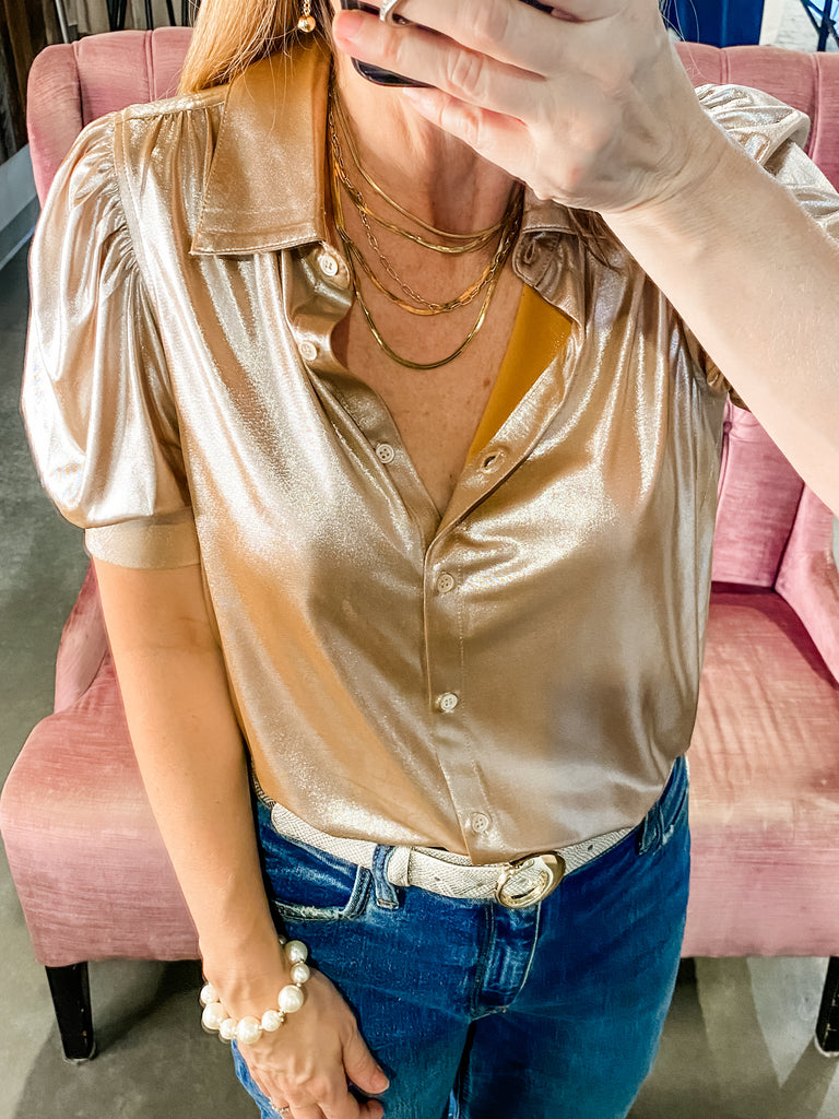 This metallic button-down blouse adds instant glamour with its glossy sheen and structured silhouette. Featuring puffed short sleeves and a classic collar, it blends modern shine with vintage inspired charm. Perfect for dressing up denim or pairing with sleek skirts for a standout look.